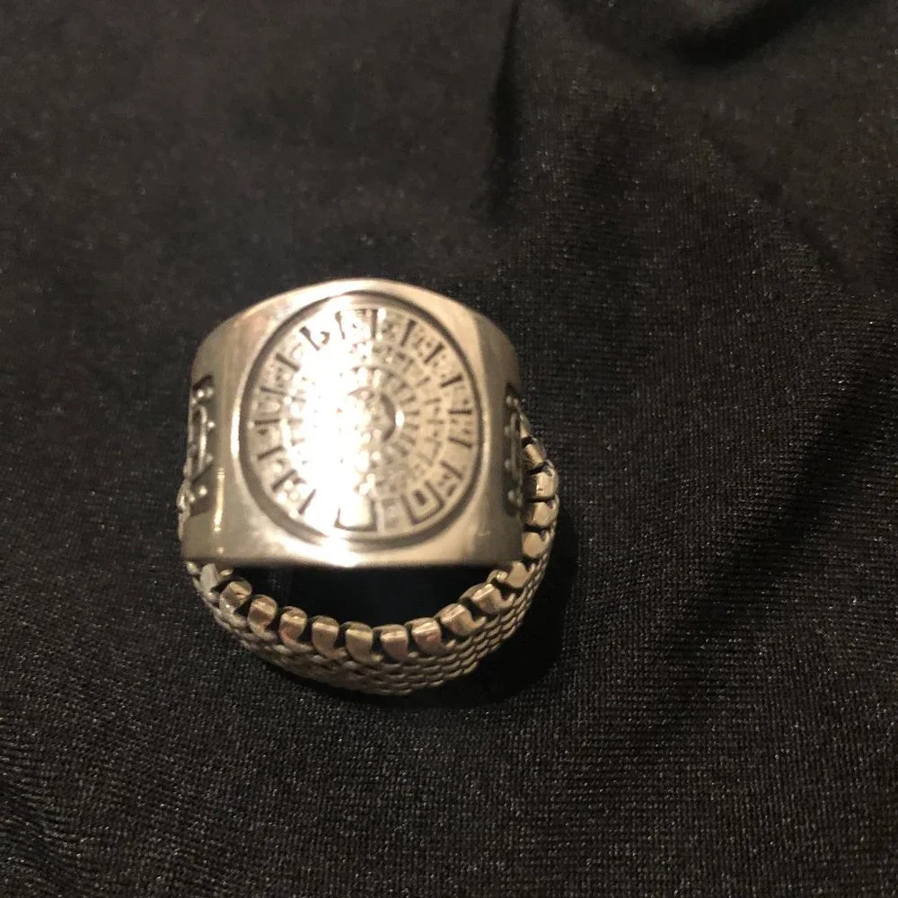 SILVER RING WITH THE AZTEC CALENDAR AS A HANDMADE PRINT ON THE SIDES ALSO HAS PRINTING*****ANILLO DE PLATA CON EL CALENDARIO AZTECA COMO ESTAMPADO HECHO A MANO EN LOS LADOS TAMBIÉN TIENE ESTAMPADO