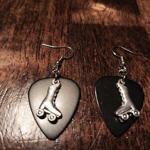 Selling Women's SILVER TONE ROLLER SKATES CHARMS ON BLACK GUITAR PICKS NECKLACE - EARRINGS SET