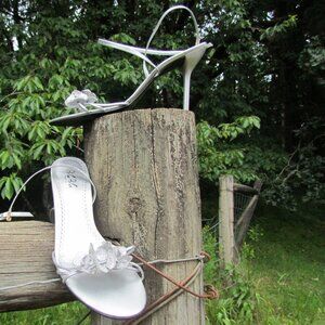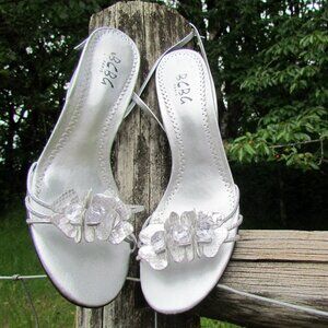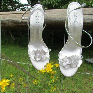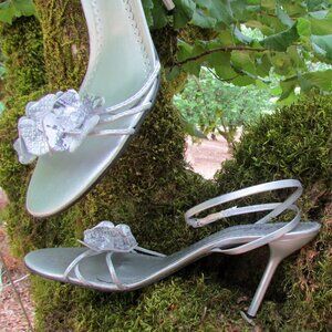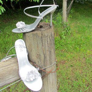SILVER SHOES, 8.5, BCBG WRAPAROUND ANKLE STRAPS, 4" SPIKE HEELS, FLORAL DETAIL