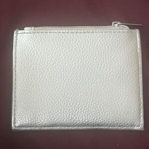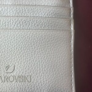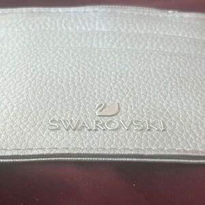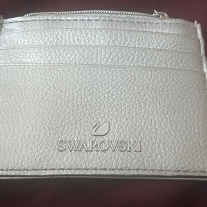 This Coin Purse and Card Holder was a Swarovski GWP(Gift With Purchase) promotional item. This silver leather like Purse and Card Holder is like new ( never used ) with SWAROVSKI and the iconic Swan Logo etched in silver. It has three credit/debit card slots on the outside, and a silver-toned zipper on top to store coins or more cards inside.