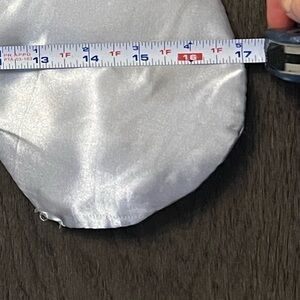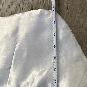 17 inches long at longest 10 inches wide at widest Satin feel with fringe and small beads