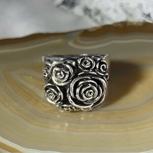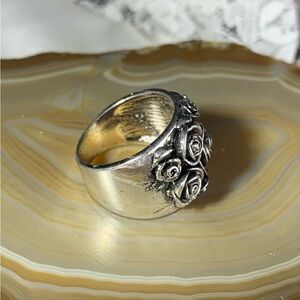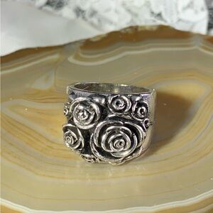 Beautiful silver ring with detailed floral patterns. Perfect for any occasion.Silver Tone Chunky Ring With Roses size 8,wide band style,tapers nicely for comfort.beautifully crafted.in new condition.