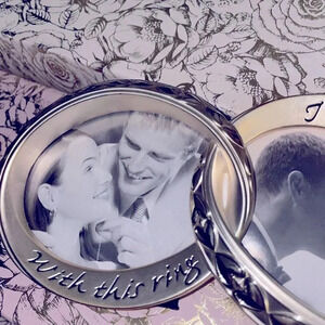 Display the highlights of your big day, with this stunning silver plated double aperture photo frame featuring intertwined wedding rings decorated with hearts and the phrase “with this ring I thee wed”