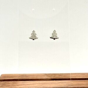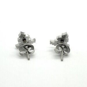 A pair of pine tree stud earrings with small cut outs to look like ornaments decorating the tree. Shown next to a penny to indicate size. Made of silver tone stainless steel. Some pictures may make the earrings look black, but this is just a reflection; they are entirely silver colored.