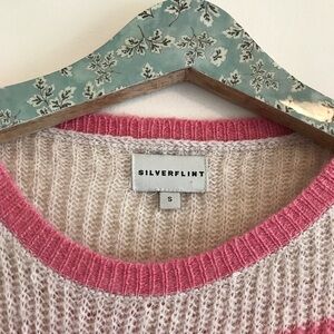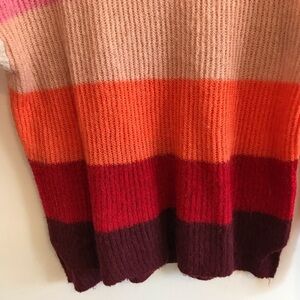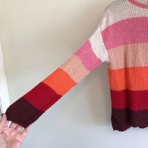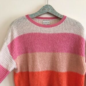 Features: Mohair style sweater, oversized and cozy, bold pink red and orange stripes, crew neck, long sleeves. Acrylic, nylon, alpaca, wool.