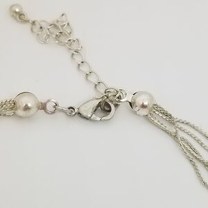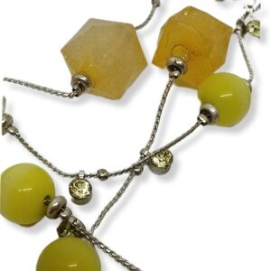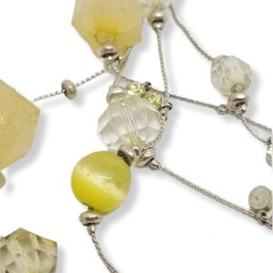 Chic layered style necklace with dainty silvertoned rope chains accented with clear and shimmery peach color acrylic beads as well as beautiful glowing yellow cats eye glass beads. Necklace measures 17 inches across with a 3 inch extender chain. Great condition