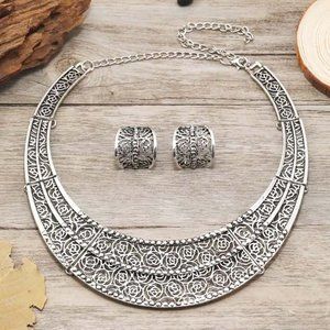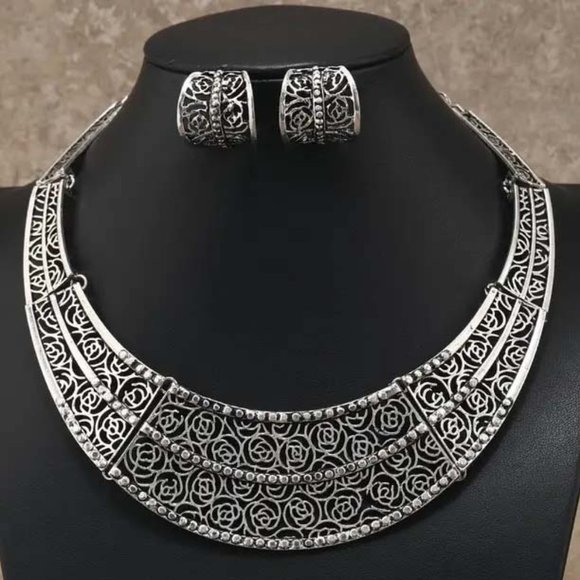 SILVERY PERSIA FILIGREE PANELS COLLAR NECKLACE & EARRINGS 49