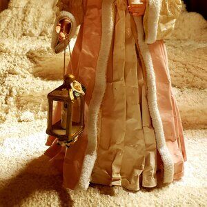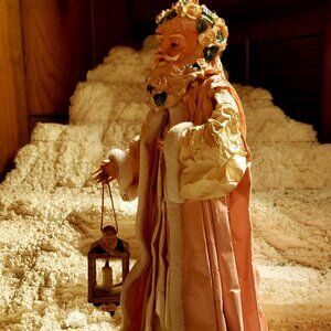 Add a unique and old-world charm to your Christmas décor with this beautiful Santa. This 14-inch Paper Mache table topper is adorned with a pink robe, white cuffs and trim with Victorian floral accents. This Santa is carrying a golden lantern to light his way. The conical shape and medium size make it perfect for accenting atop any Christmas tree or use it as table décor or as the final touch to your Christmas trimming in any room.