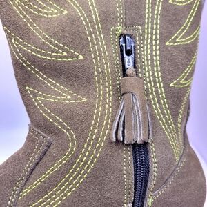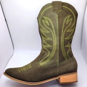 Step into a world of timeless elegance with these olive green embroidered cowboy boots, designed for the modern trailblazer. These boots boast a rich olive green hue, accentuated by intricate yellow embroidery that adds a touch of charm. The suede finish gives them a soft, luxurious feel, while the classic cowboy boot silhouette ensures a perfect blend of style and tradition. The pointed toe and sturdy wooden heel provide both comfort and durability, making them ideal for any occasion. Whether you're heading to a country event or elevating your everyday look, these boots are a versatile addition to your wardrobe.
