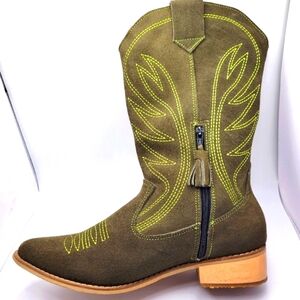 Step into a world of timeless elegance with these olive green embroidered cowboy boots, designed for the modern trailblazer. These boots boast a rich olive green hue, accentuated by intricate yellow embroidery that adds a touch of charm. The suede finish gives them a soft, luxurious feel, while the classic cowboy boot silhouette ensures a perfect blend of style and tradition. The pointed toe and sturdy wooden heel provide both comfort and durability, making them ideal for any occasion. Whether you're heading to a country event or elevating your everyday look, these boots are a versatile addition to your wardrobe.