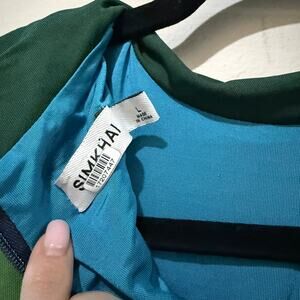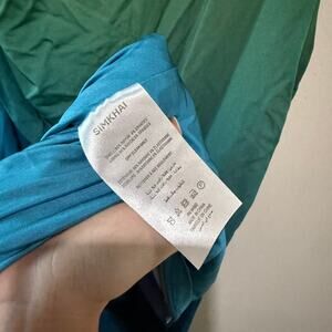 SIMKHAI Aldina Dress. Women's Size L / Large. Features long midi maxi length, stretchy jersey fabric, ombre effect of green and blue, mock neck, back zip closure, fitted silhouette with slight flare to skirt, lined. 96% rayon, 4% spandex. Great used condition, no notable flaws. Retail $645.