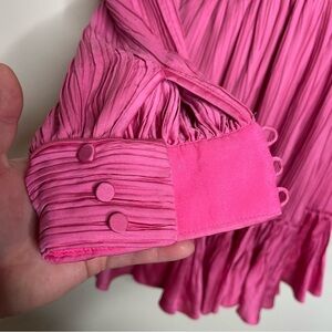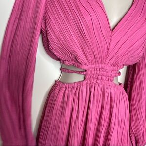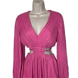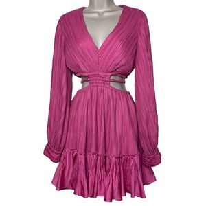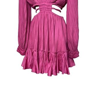 SIMKHAI Londyn Pleated Waist Cut-Out Minidress Hot Pink sz XS. Gently used condition, no flaws, Pleated long sleeve minidress with elasticized wraparound waist cut-outs and a ruffle flounce hem. Plunging V-neck Long sleeves with button cuffs Elasticized waist cut-outs Concealed side zip Pullover style 100% polyester Dry clean Imported SIZE & FIT About 36" from shoulder to hem