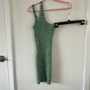 Green knit (83% Cotton, 16% Nylon, 1% Spandex). Sheath. Sleeveless. Asymmetric. Pull on. 37" from shoulder to hemline. Imported.