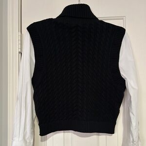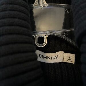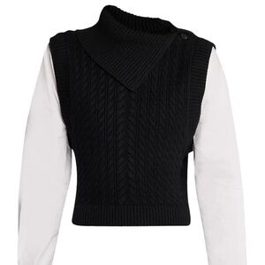 SIMKHAI white long sleeve black vest pullover. Size S. Great pre-owned condition. Fold over neckline, button detail. Long sleeves, button cuffs. Cable knit bodice. Ribbed hem. Relaxed fit. Cotton/wool. Approximate measurements: 19” sweater length, 17” armpit to armpit and 22” sleeve length. Dry clean only. Ships next day!