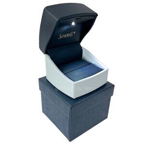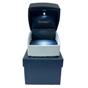 This beautiful, contemporary ring presentation gift and/or storage box is a gray-ish and blue duel-tone with an allover smooth texture. The brand’s name "Simon G." is slightly embossed in gold on the front lid. Operates on a hinged mechanism. The interior ring slot is cushioned for extra protection for your jewelry. Comes in its own counterbox that is composed of blue, textured cardboard.