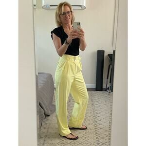 The SIMON MILLER Butter Yellow Galen Pants in Size Large feature a stylish paper-bag waist that flatters the silhouette while adding a contemporary twist. Crafted in a soft, lightweight fabric, these fitted pants offer comfort with a touch of structure. The subtle butter yellow hue brings a fresh, cheerful vibe to any casual outfit. Designed with a high-rise waist and a tapered leg, they balance ease and polish effortlessly. Adjustable waist ties enhance fit and style. Perfect for pairing with tucked-in tops or cropped blouses. A chic choice for both casual days and elevated lounging.