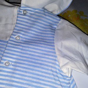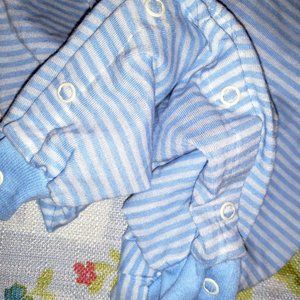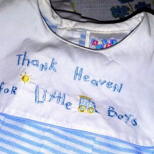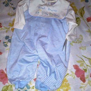 Dress your little one like a prince! Vintage-but-new-with-tags, size 6 months. Alexis is the brand & it appears that they no longer make clothing. Simply adorable, this soft knit long bubble romper sports light blue/white stripes, soft rib-knit leg cuffs, woven cotton bib collar & sleeves in solid white to give appearance of separate shirt. Full bib collar includes embroidery: "Thank Heaven for Little Boys" w/train theme. 3-button rear placket. SFPF home.