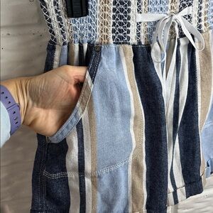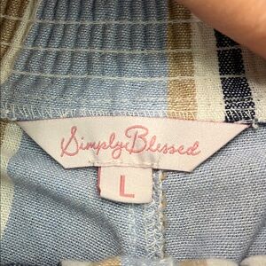 Bought and never worn condition pair of shorts from Simply Blessed. Looks and feels like a heavy linen but is a cotton rayon blend. Large pockets. Pull on style. Wide waistband that is smocked with lots of stretch. Stretches from 11 inches to 19 inches. Loose fit in the thigh. Cuffed hem. Drawstring is just for looks.