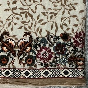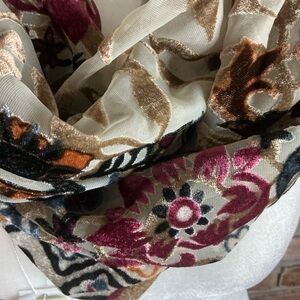 Beautiful multi-color nylon and viscose infinity scarf with flora flocking. Lightweight and easy to style, it measures 21” wide and 66” long (pic shows scarf folded in half). Like new with no flaws. Please look over the pictures carefully and let me know if you have any questions.