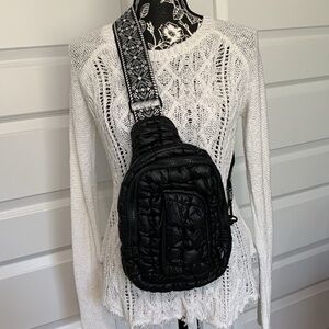 Stylish black quilted crossbody bag with a patterned strap. Perfect for everyday use.