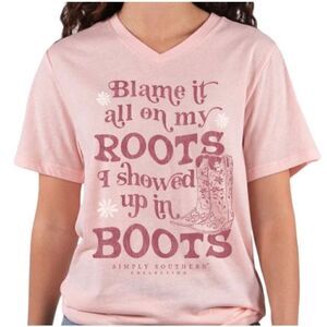 SIMPLY SOUTHERN LARGE “Blame it on My Roots I showed up in Boots” V-Neck TShirt