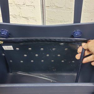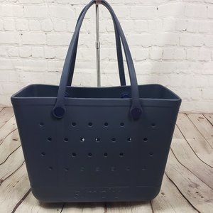 SIMPLY SOUTHERN Large Navy EVA Tote Looks and acts like a Bogg Bag, but without the hefty price! Waterproof EVA easy to clean & sanitize. Removable handles Holes for charms or to let sand and water out Wide grip bottom keeps it upright Removable zipper pouch snaps to the side. This bag is VERY LARGE W:19" x H:14" x D:9.5"