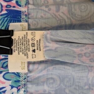 It's a Simply Southern pink blue and teal (in varying shades with white mixed in) off the shoulder top that's comes in a size of small.