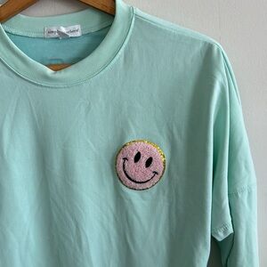 Soft and comfy teal/mint blue long sleeve oversized tee. Patches on front and back with glitter. Made with 100% polyester.