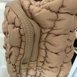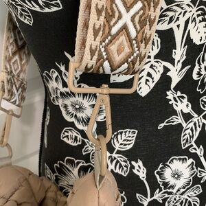 Stylish tan quilted crossbody bag. Features a unique patterned strap. Perfect for everyday use.