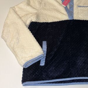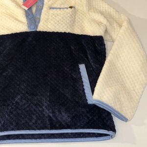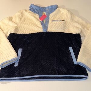 brand new with tags womens SIMPLY SOUTHERN pull over 5 snap button up - VERY SOFT - great sweater - SIZE LARGE - blues / white - has pockets