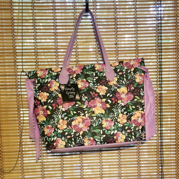 Beautiful Simply spring large tote with lavender handles and ribbons on each side, New