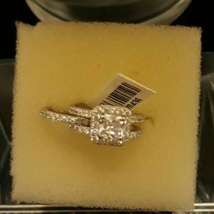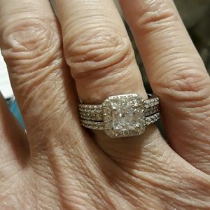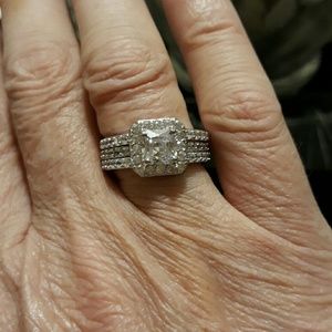 Breathtaking set of simulated diamond wedding set. Silvertone set size 7.50, 1.87 carats.