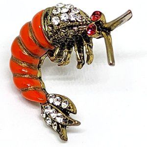 Cute quality vintage lobster with pink rhinestone eyes, white rhinestone accents and an orange lucite/plastic tail.