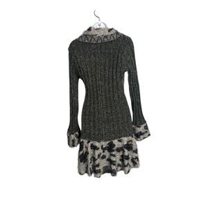 Make a statement in this unique SIONI long-line cardigan/sweater coat. Featuring a stunning patchwork mix of knit patterns-from argyle-like diamonds to chunky ribbing and a fuzzy, abstract floral or leopard print-this piece is a wearable work of art. The black and gray color palette, shawl collar, and bell cuffs with fuzzy trim give it a cozy, bohemian, and slightly retro vibe. Button-front closure.