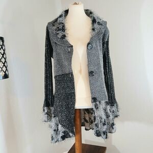 Gray and Black multi-print long sleeves, cardigan sweater top. Front big button closure. It's new with tags. Please refer to pictures for best description and condition verification.
