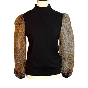 SIONI Sheer Leopard Print Puff Long Sleeve Black Mock Neck Sweater Size M