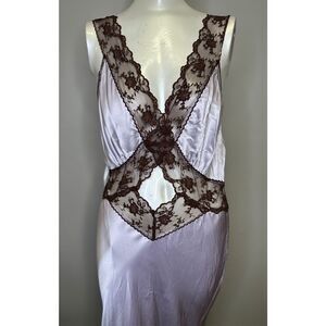 Designed with a body-skimming silhouette and an ankle length. Silk satin has a smooth and cool hand. An alternative bra is recommended due to the sheer lace trim and deep V neckline.