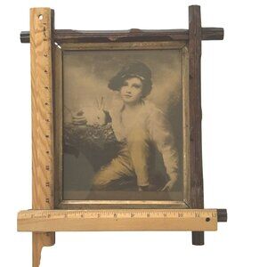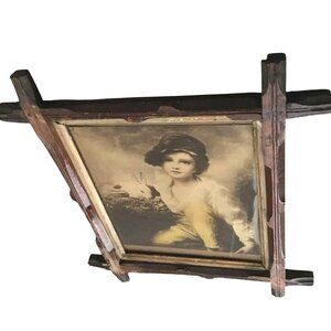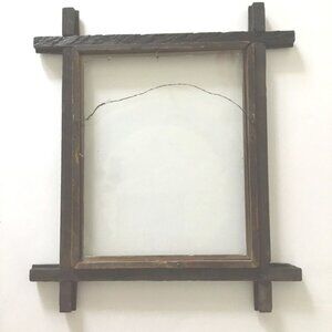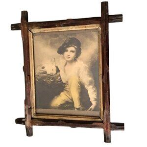 Housed in a beautifully aged, handcrafted rustic wood frame with deep character—visible nail joints, raw wood grain, and natural wear throughout.