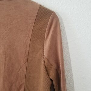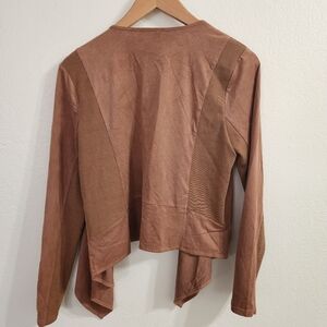 Super soft waterfall style jacket with ribbing. Feels almost like suede. Contains spandex. Size LP. EUC.