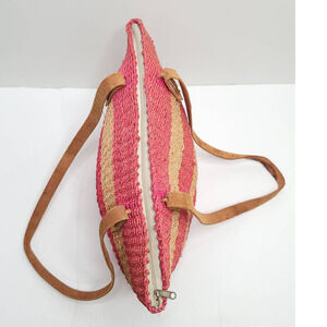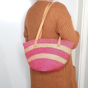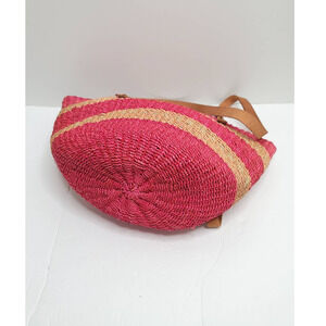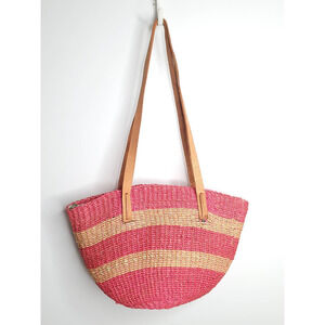 SISAL TOTE BAG VINTAGE STRAW PURSE LEATHER STRAPS BEIGE Pink WOVEN Bag