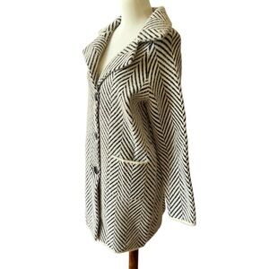 Womens size Small, white and black Chevron striped pattern, oversized, relaxed fit, mid-length, 3 button front, large patch pockets.