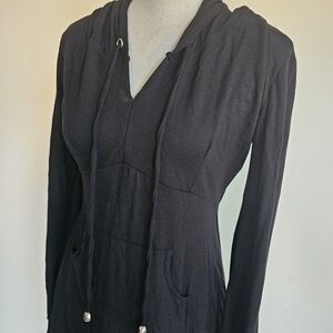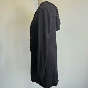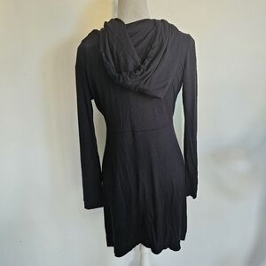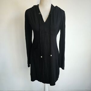 Sita Couture black "Earth Mermaid" hoodie mini dress with drawstring hoodie, long sleeves, and front pocket.