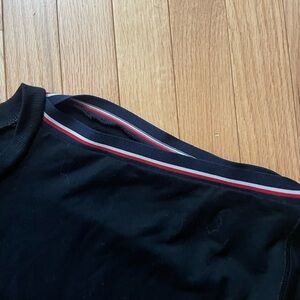 Black long sleeve with open shoulders bordered with red lining. Includes tie on inside of the bottom of the top. AI