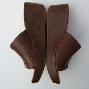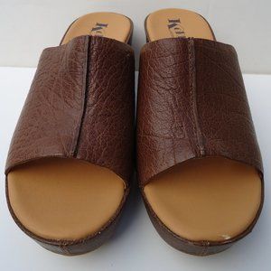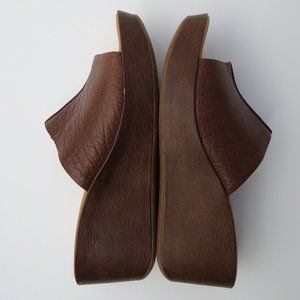 SIZE 10. KORKS BY Kork-Ease Greer leather platform wedges slide sandals. Brown leather upper. Slide on cushioned footbed. Synthetic outsole. Approx. 3" wedge. Approx. 1.25" platform. Just in time for spring and summer! From a smoke-free home. Clean inside and out. Good preowned condition. Please zoom in all pictures for details and condition. Item in pictures is the exact item you are purchasing.