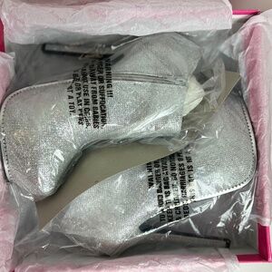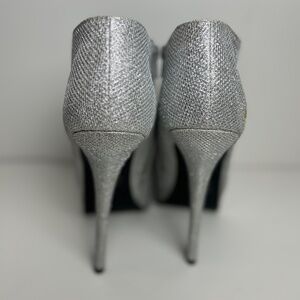 Size 10 Women's Silver Glitter Ankle Boot. 6 1/2" Platform Stiletto Heel. Barely worn. Small blemish on the right boot (see image). Chic, Stylish, Special occasion, Holiday outfit, Christmas, New Year's. #preowned