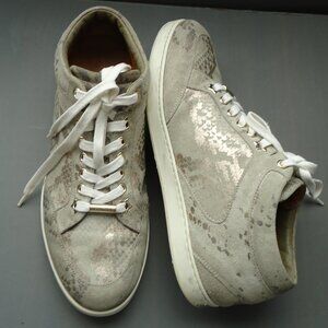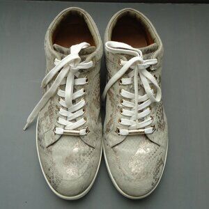 SIZE 38. Jimmy Choo suede leather Miami walking casual sneakers shoes. Comfort women's. White / grey/gold metallic snakeskin print. Suede upper with metallic finish. Leather lining. Rounded toe. Star shaped eyelets. Lace up. Gold tone metal logo at heel and lace. Rubber sole.