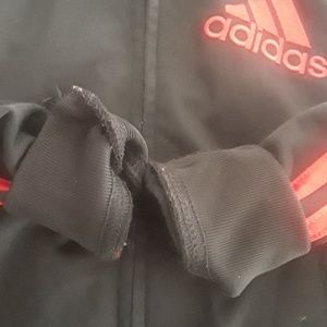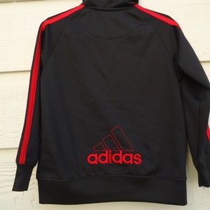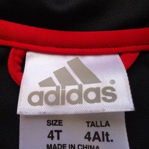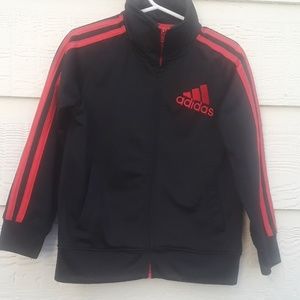 SIZE 4 T. ADIDAS full zip-up little kids track jacket. Long sleeves with the 3 red stripes down them and the adidas symbol on the front and back. 2 slide pockets on the front(do not zip). From a smoke free home. Good preowned condition. Please zoom in all pictures for details and condition. item in pictures is the exact item you are purchasing.