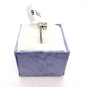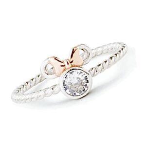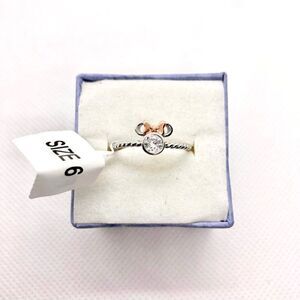 Size 6. Solid 925 sterling silver Minnie Mouse ring. The ring is Minnie’s head’s silhouette, with a large clear CZ crystal as her head and empty ears, and a rose gold toned bow on top. The band is braided / twisted style.