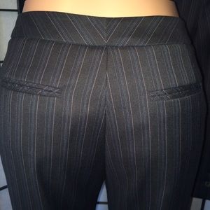 Beautiful 2-piece suit with baby blue lining. Pinstripes are blush pink and baby blue colored. Jacket is detailed with square metal buttons. Front single button closure with 3 buttons on the wrist of sleeve, two pockets in front. Pants have slit pockets in the back only. Front hook and zipper closure. This suit is lovely and new without tags. Never worn.