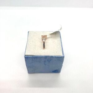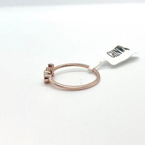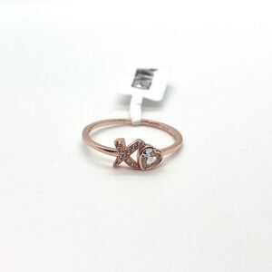 Size 8. Rose gold plating over 925 sterling silver ring. The focal point of the ring is an "X" encrusted with tiny white / clear CZ stones and an "O" in the shape of a heart with a larger CZ crystal filling it. Stamped 925 on the inside of ring.